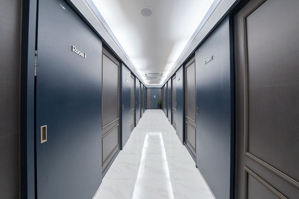사당역 스웨디시 복도를 지나 관리실로 이동을 해보겠습니다. 이 곳을 지나는 동안 양쪽을 보면 커다란 문들이 보일 거예요. 미닫이 형식으로 되어있어서 문에 끼일 걱정도 거의 없고 일단 열고 닫는 게 굉장히 편리하기 때문에 고객들이 머무는 동안 불편한 요소가 하나 줄어든 느낌입니다.